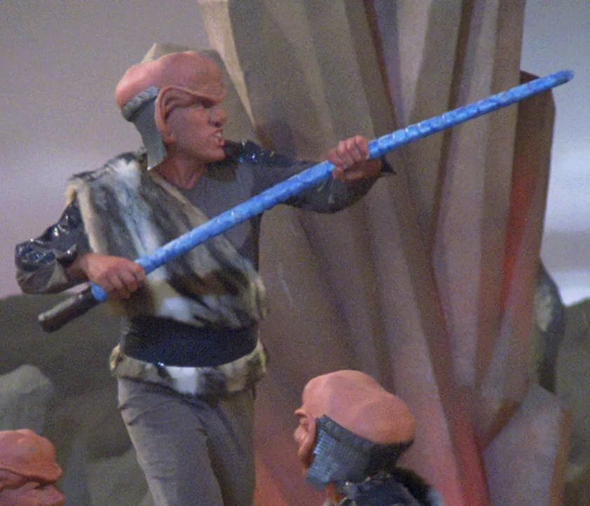 The Ferengi energy whips made their debut appearance in "The Last Outpost". The whip was designed by props master Alan Sims, who noted, "It was a variation of the Star Wars light saber." (Star Trek: Aliens & Artifacts, p. 102)