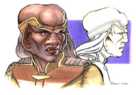 The facial appearance of the Ferengi was designed by Andrew Probert, and refined and produced by Makeup Supervisor Michael Westmore. (Star Trek Encyclopedia 2nd ed., p. 152) Westmore recalled how he and his department altered Probert's initial designs for the species; "We took the drawings and eliminated the chin, and we changed from a batlike ear to a round ear; the pointed ones look like giant Vulcan ears, but by rounding them off we still got a big-eared effect." (Star Trek: The Magazine Volume 2, Issue 12, p. 26)
